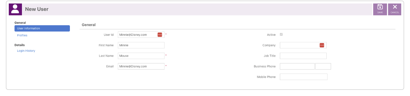 - Next, fill out the required fields on the New User edit screen. Some fields my pre-populate with the data that is being pulled from the Household level within Orion. If you need to use different information, simply erase and fill out the fields manually.